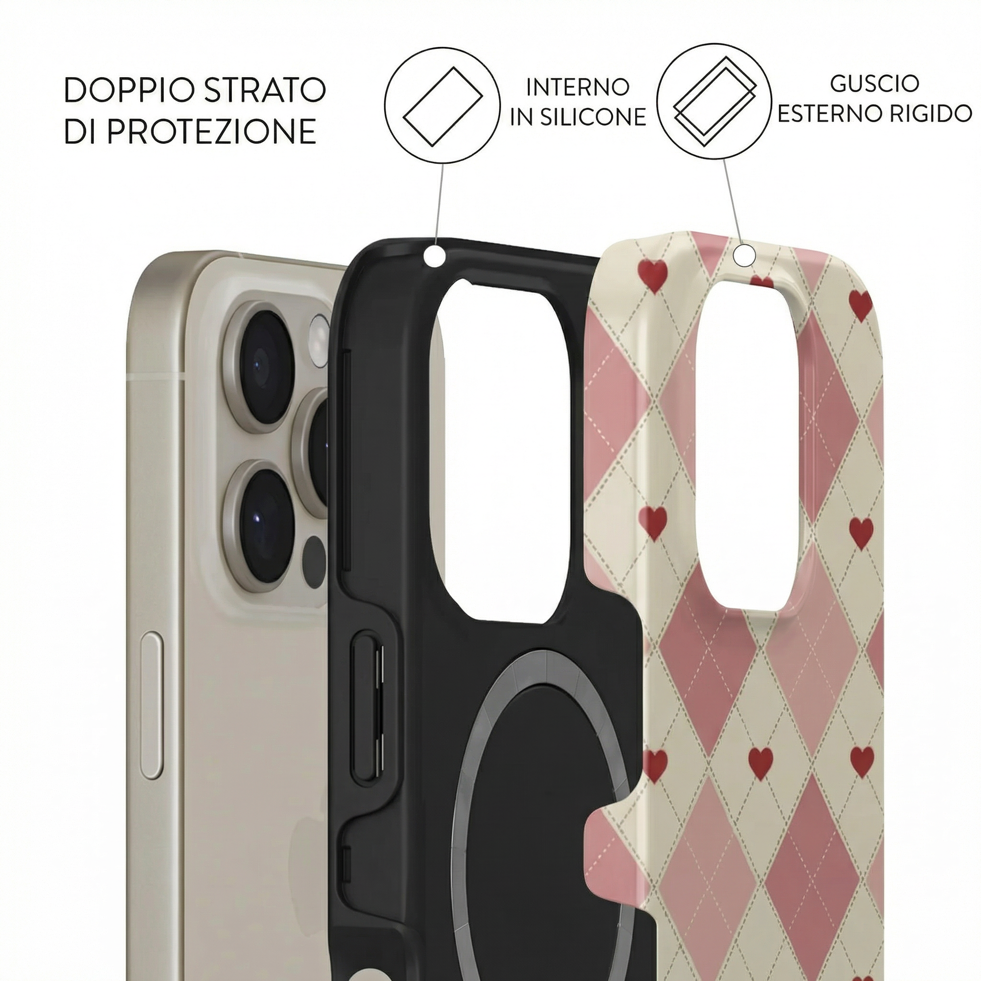Ogni modello è composto da un doppio strato: una base in silicone antiurto che avvolge il dispositivo, unita a una scocca rigida esterna con stampa ad alta definizione.