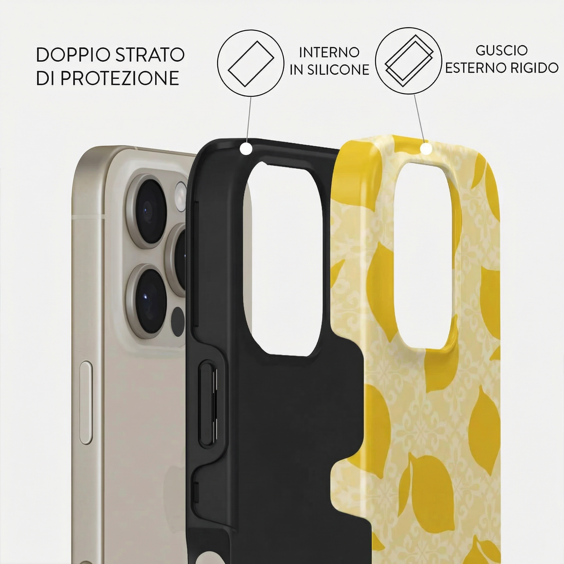 Ogni modello è composto da un doppio strato: una base in silicone antiurto che avvolge il dispositivo, unita a una scocca rigida esterna con stampa ad alta definizione.