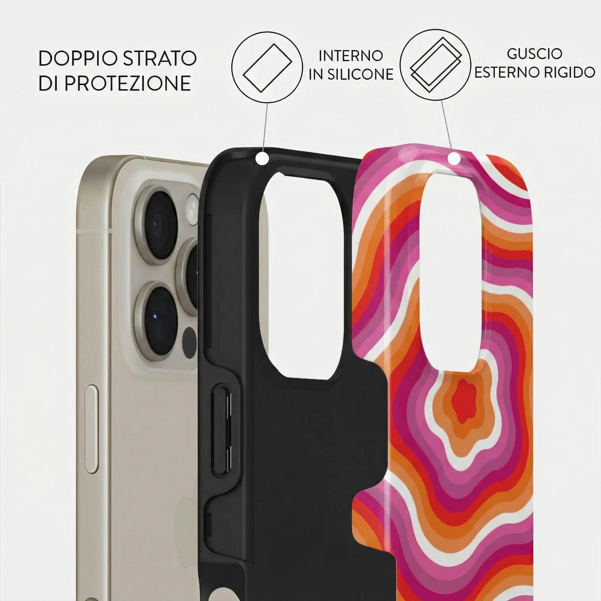 Ogni modello è composto da un doppio strato: una base in silicone antiurto che avvolge il dispositivo, unita a una scocca rigida esterna con stampa ad alta definizione.