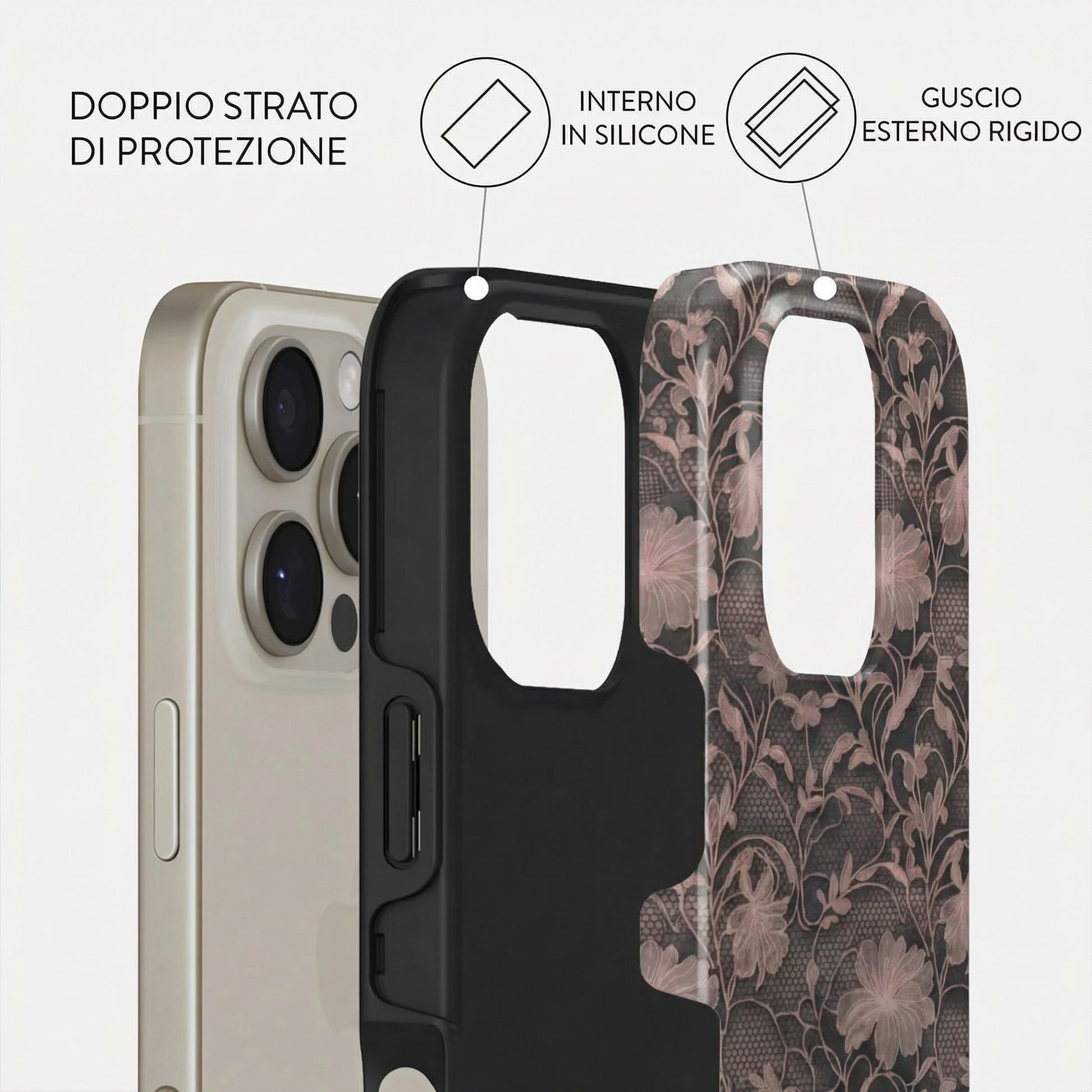 Ogni modello è composto da un doppio strato: una base in silicone antiurto che avvolge il dispositivo, unita a una scocca rigida esterna con stampa ad alta definizione.