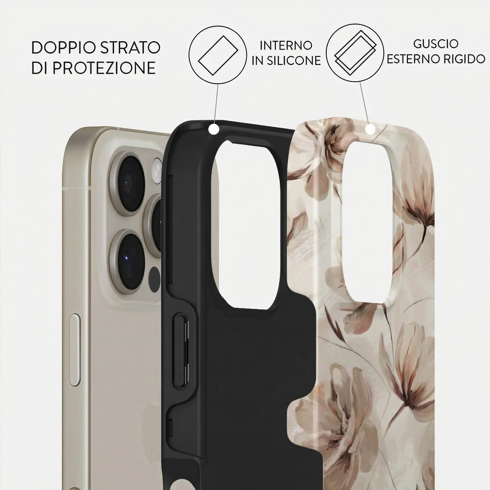 Ogni modello è composto da un doppio strato: una base in silicone antiurto che avvolge il dispositivo, unita a una scocca rigida esterna con stampa ad alta definizione.