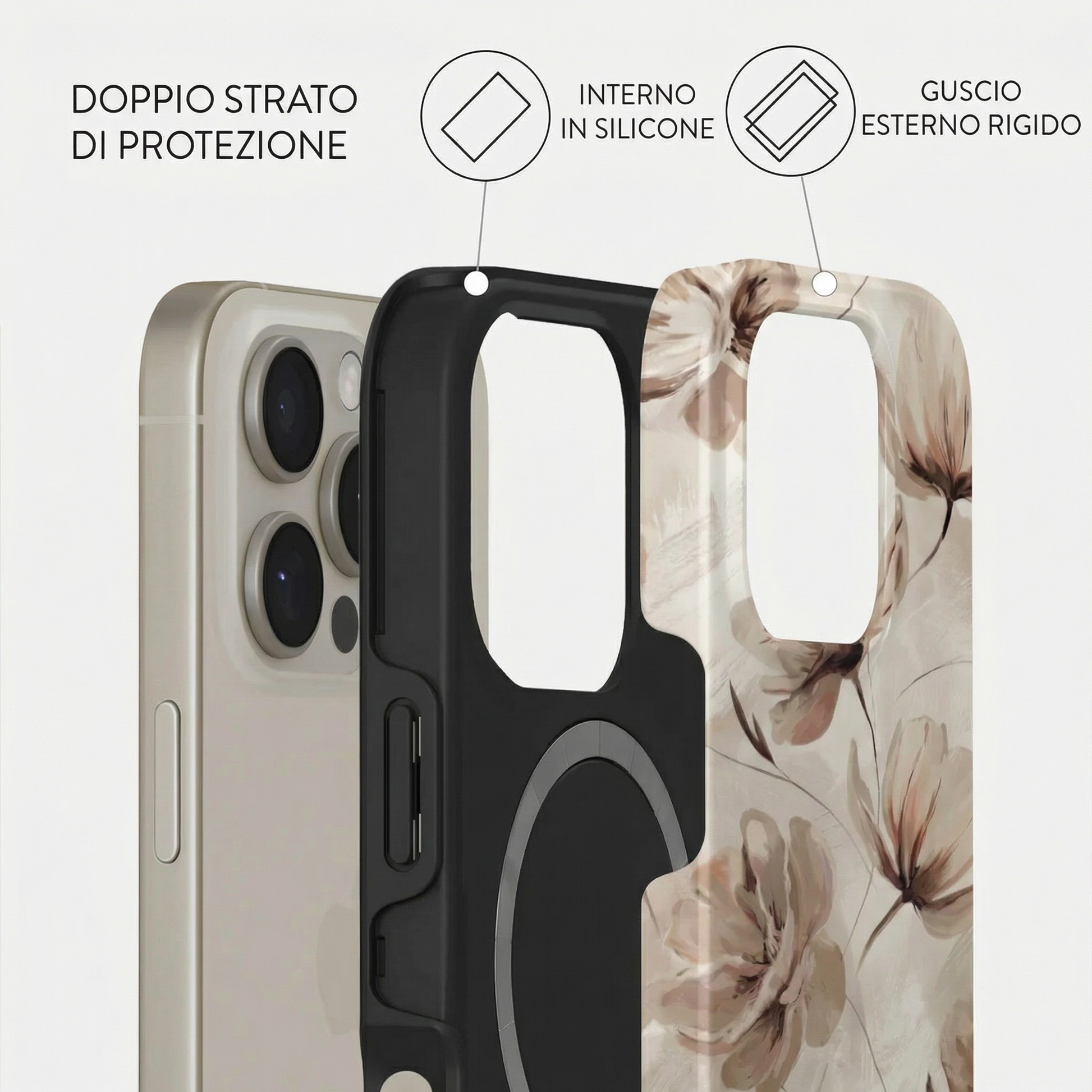 Ogni modello è composto da un doppio strato: una base in silicone antiurto che avvolge il dispositivo, unita a una scocca rigida esterna con stampa ad alta definizione.