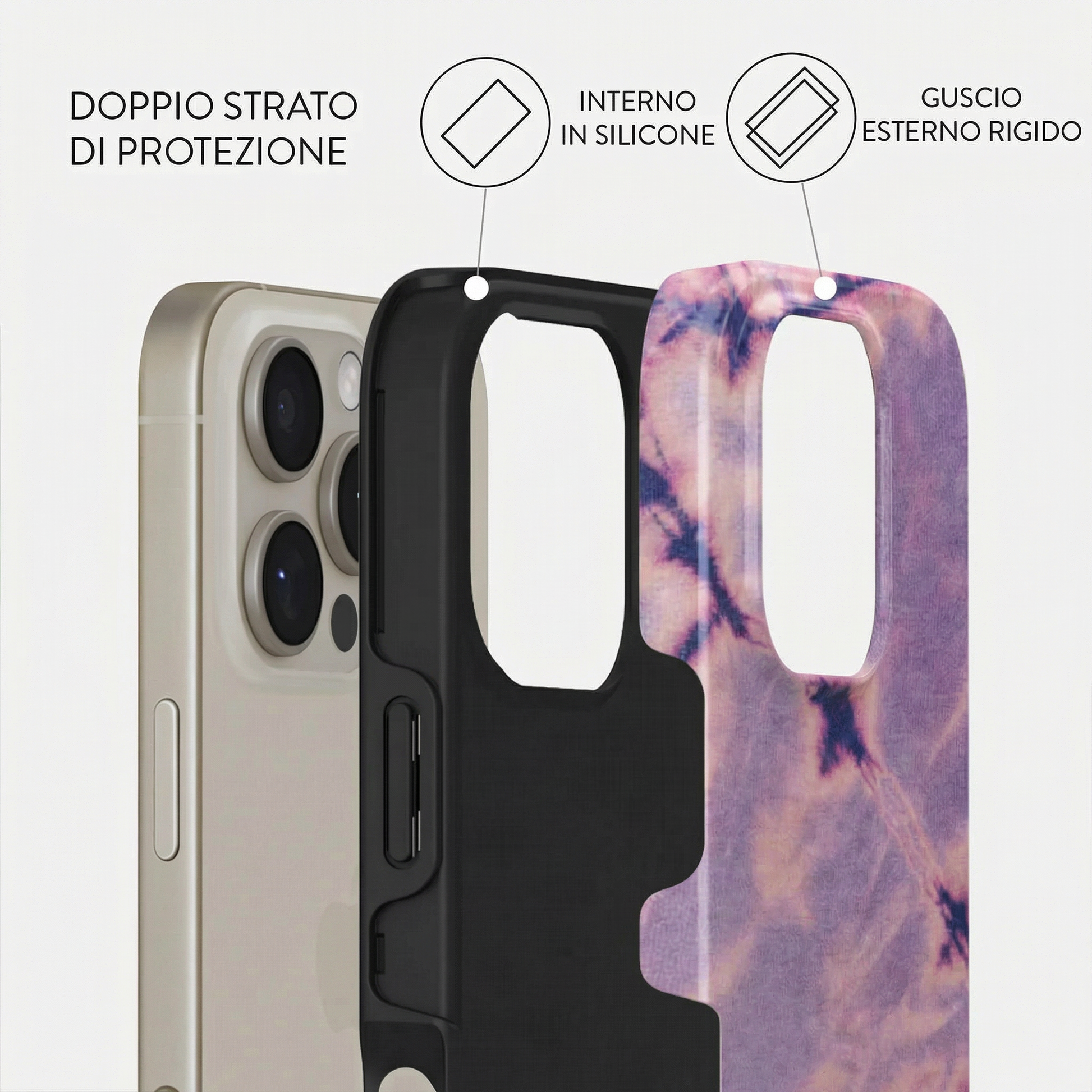 Ogni modello è composto da un doppio strato: una base in silicone antiurto che avvolge il dispositivo, unita a una scocca rigida esterna con stampa ad alta definizione.