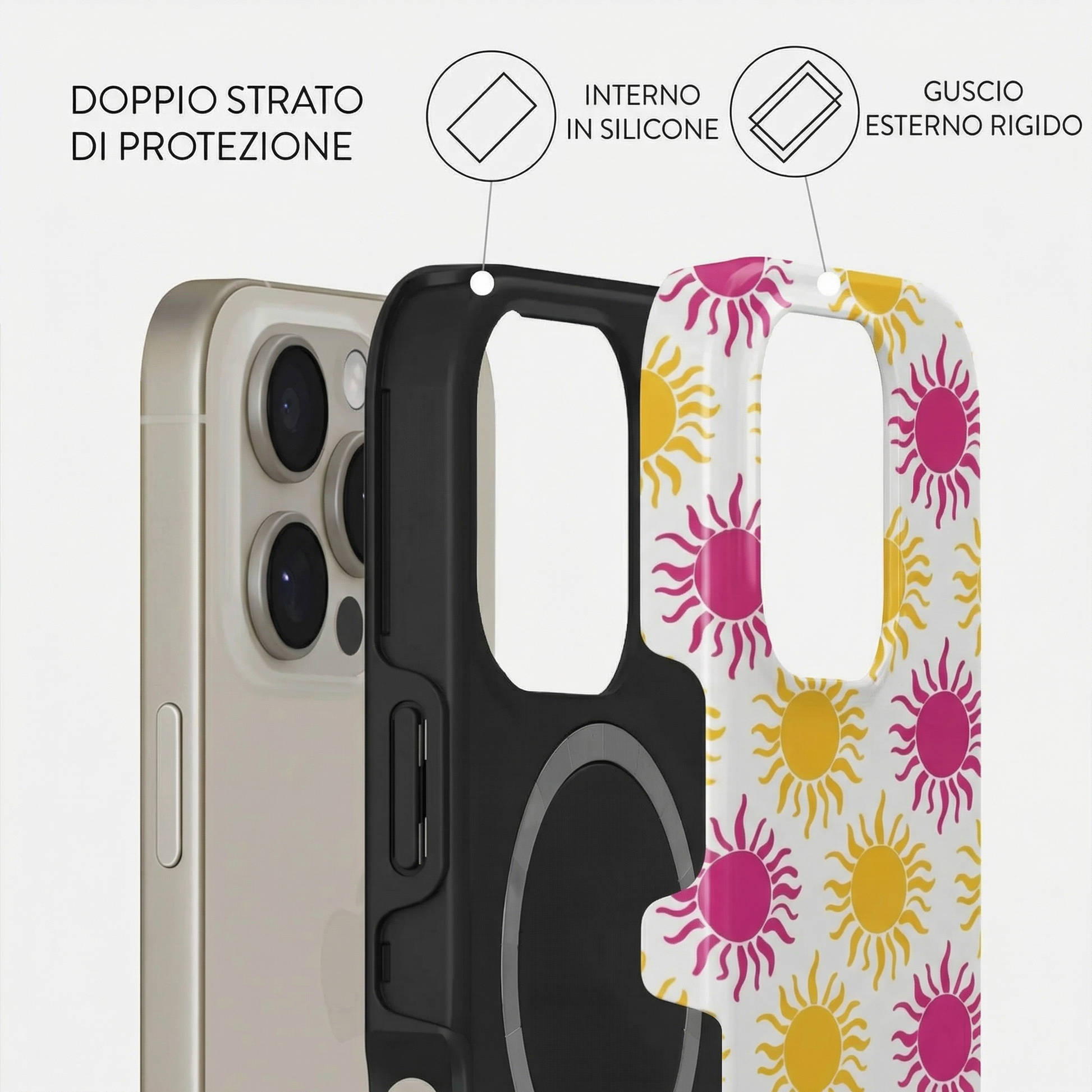 Ogni modello è composto da un doppio strato: una base in silicone antiurto che avvolge il dispositivo, unita a una scocca rigida esterna con stampa ad alta definizione.