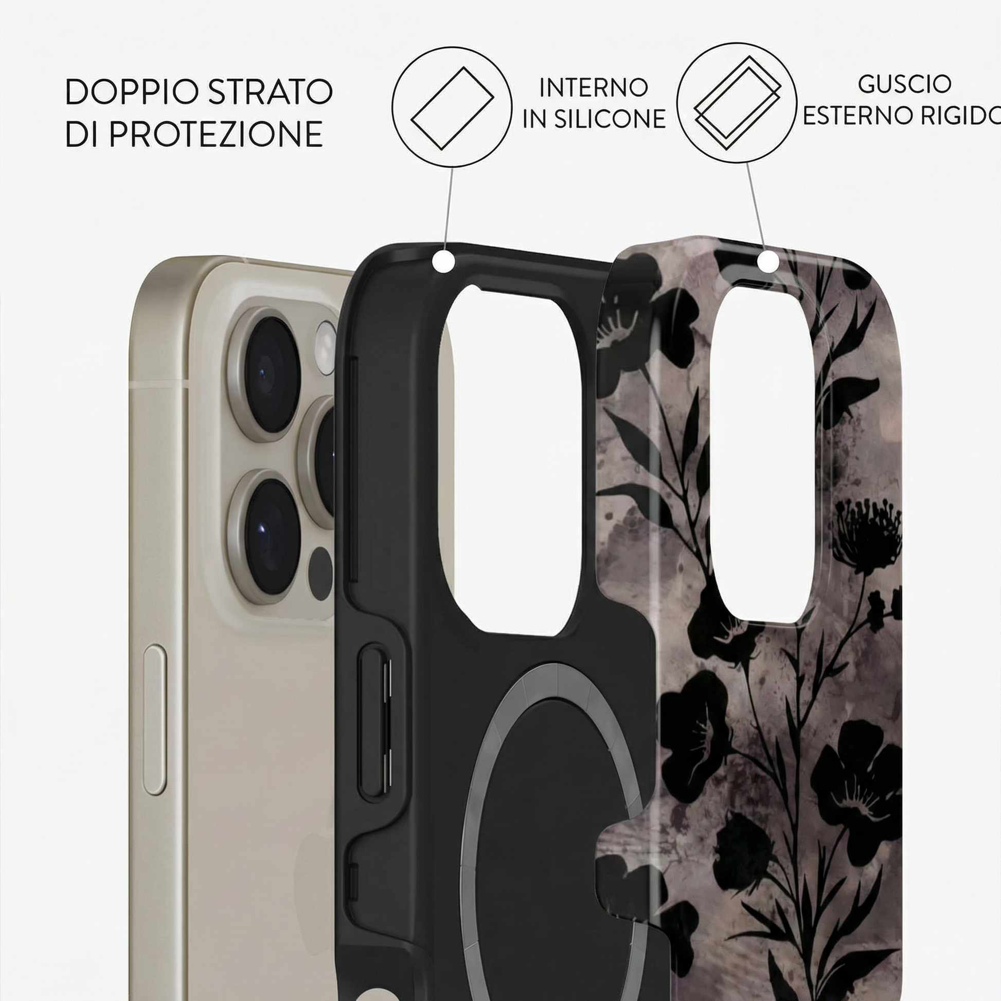 Ogni modello è composto da un doppio strato: una base in silicone antiurto che avvolge il dispositivo, unita a una scocca rigida esterna con stampa ad alta definizione.