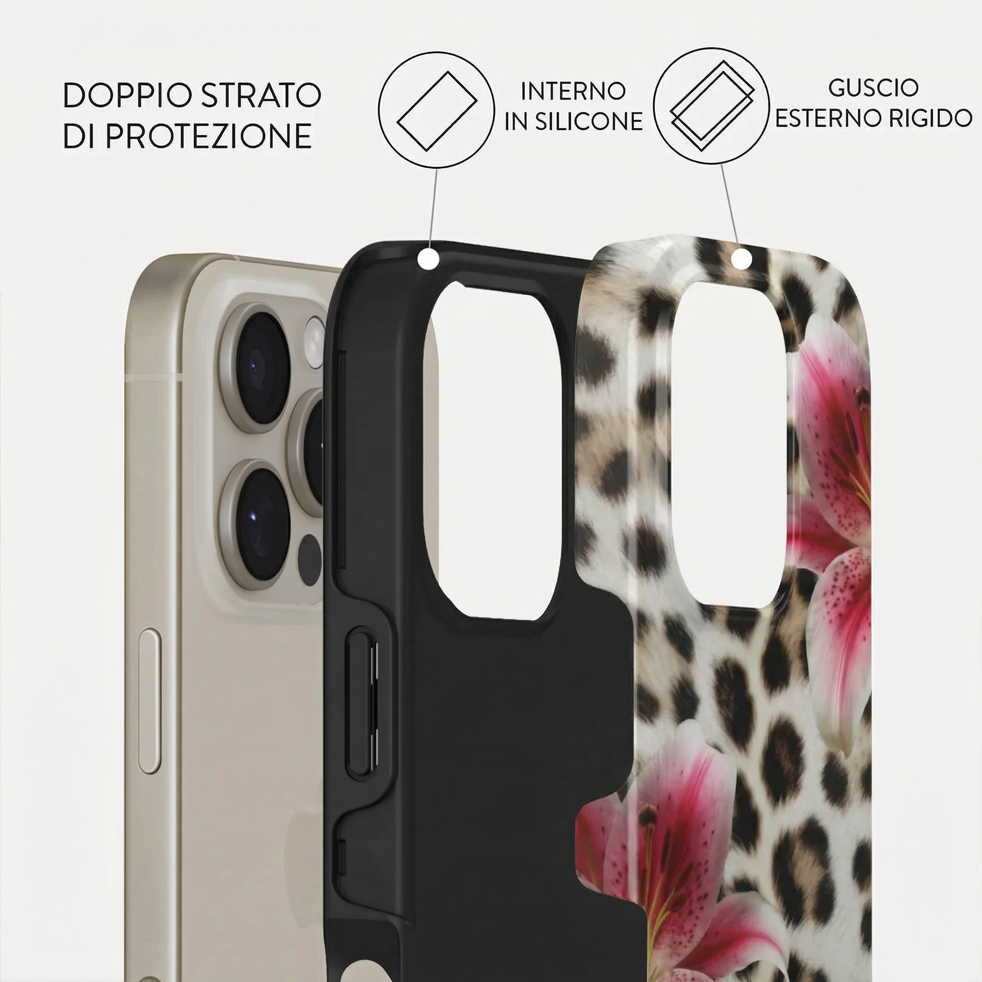 Ogni modello è composto da un doppio strato: una base in silicone antiurto che avvolge il dispositivo, unita a una scocca rigida esterna con stampa ad alta definizione.